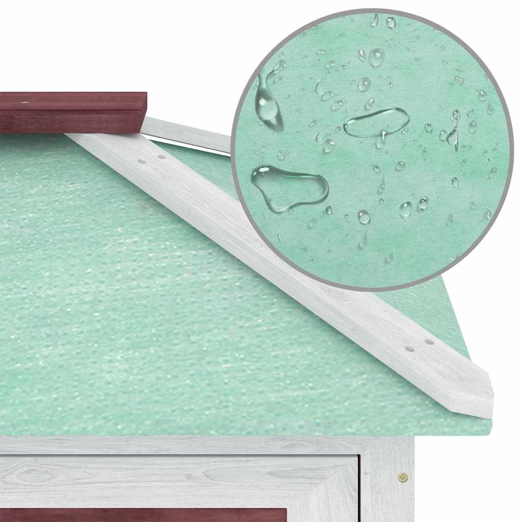 The animal hutch is built with fir wood frame, which lasts for years. Its green roof keeps rain away while the cozy cubby makes the perfect sleeping area. The easy-climb ladder leads from the lower ground level to the upper floor. The pull-out tray makes cleaning easy. And the doors close easily. This wooden rabbit cage is perfect for small pets.