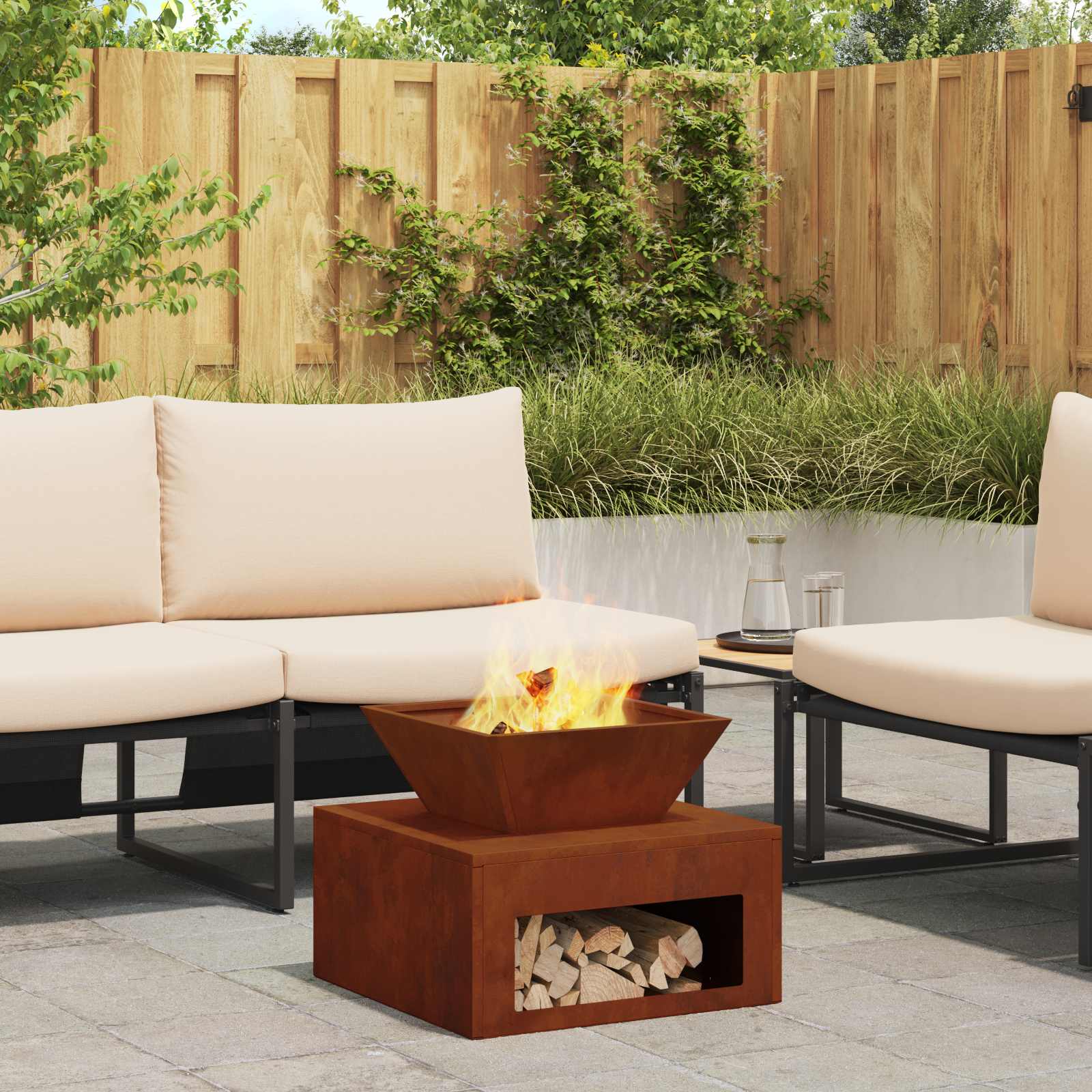 - Modern Design: Emphasizing simplicity and functionality, the fire pit features a geometric cubic shape that seamlessly fits into contemporary outdoor settings. Its minimalist form accentuates clean aesthetics, allowing it to blend effortlessly with various garden decors.