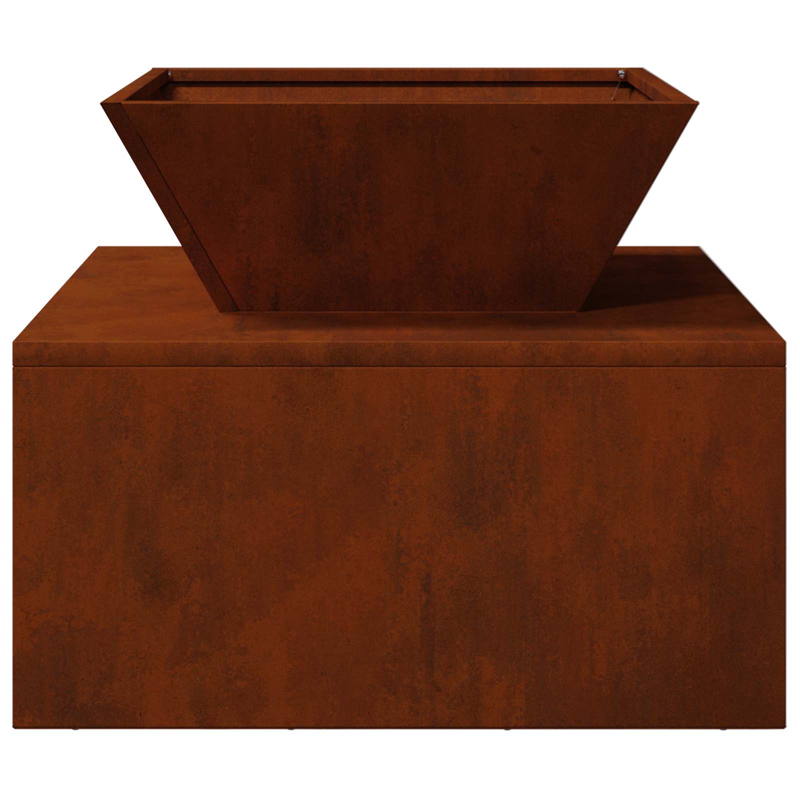 This outdoor fire pit, made from robust steel, is engineered to withstand high temperatures, providing warmth and ambiance for outdoor gatherings. Its cubic form and modern style with clean lines and minimal ornamentation make it a sleek addition to any garden or terrace setting.