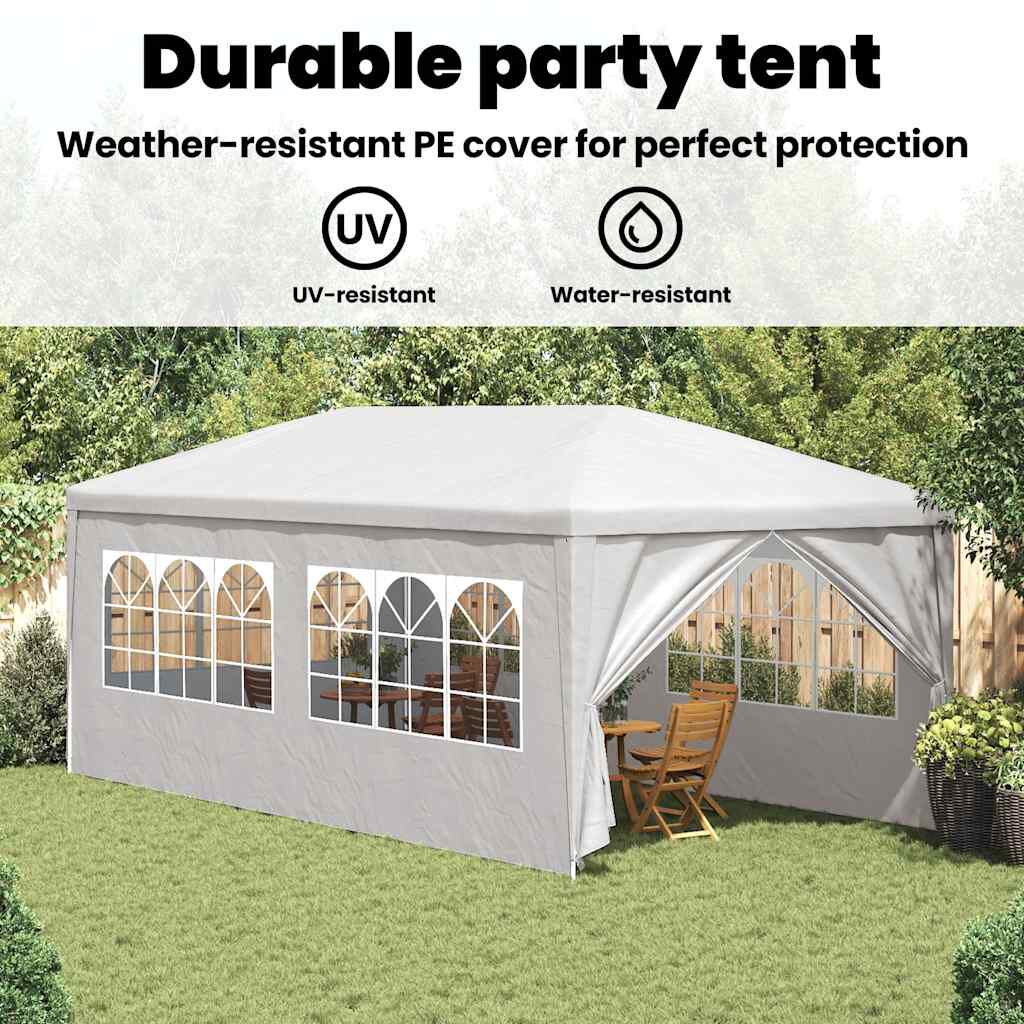 The garden marquee is made of UV- and water-resistant polyethylene material and therefore very practical for outdoor use. The frame is manufactured from rust-resistant steel, making the outdoor canopy stable and durable. The party tent has side panels, each with decorative windows, and 1 door panel with a zip for easy entrance. The garden gazebo is easy to assemble.