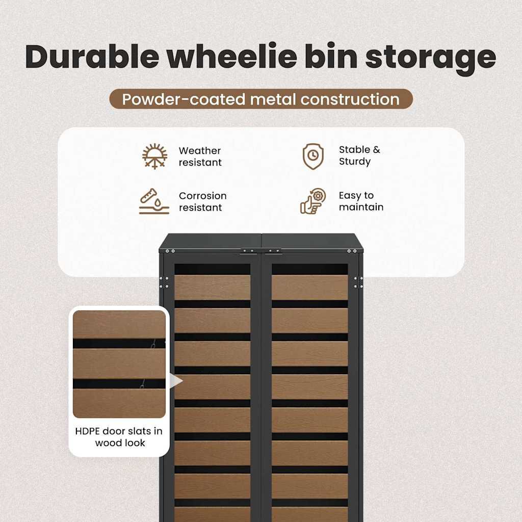This Wheelie Bin Storage offers a chic solution for organizing outdoor waste containers while maintaining an attractive garden or terrace appearance. Its modern design seamlessly integrates with various outdoor settings, providing both functionality and aesthetic appeal. Engineered for outdoor use, this storage organizer is designed to withstand conditions, ensuring long-lasting service while keeping your space clutter-free. Ideal for those who value organization and neatness in exterior environments, this solution aids both utility and stylish presentation.